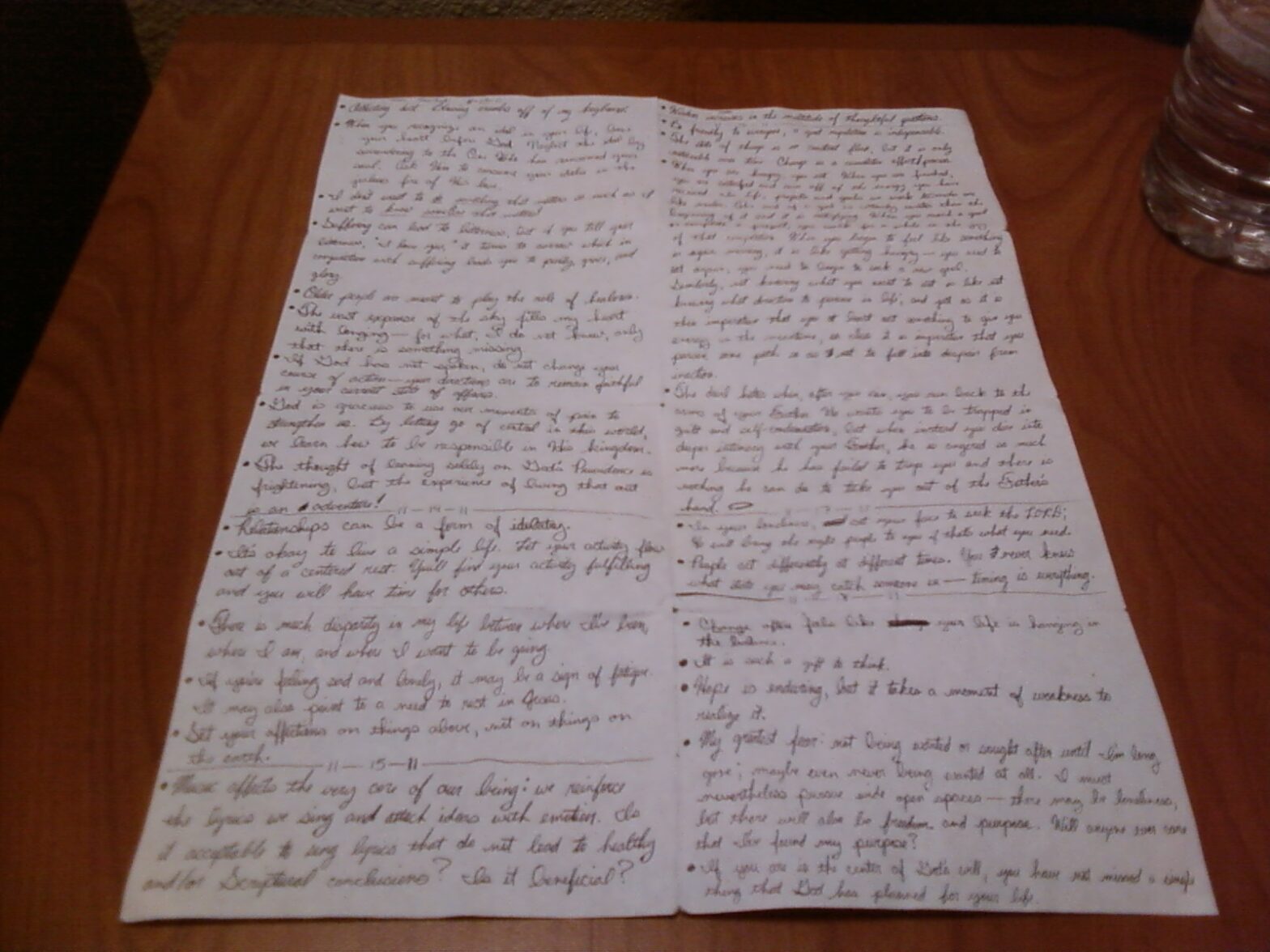 I’ve been keeping record of my thoughts lately. Over the last six days, every time I have a thought that is particularly profound in a personal sense (I am blessed to have quite a few), I write it down. I have filled an entire page in six days, and the results are interesting. I am able to read through it and be reminded of lessons that I have learned and perspectives that I desire to maintain. I am also becoming more aware of questions and longings in my heart. Something I have particularly enjoyed though is the ability to stop thinking about ideas that I want to remember. Writing everything down has allowed me to clear my head for my thoughts to continue to flow and lead me to some logical conclusions and some questions that dig even deeper into my original processes.